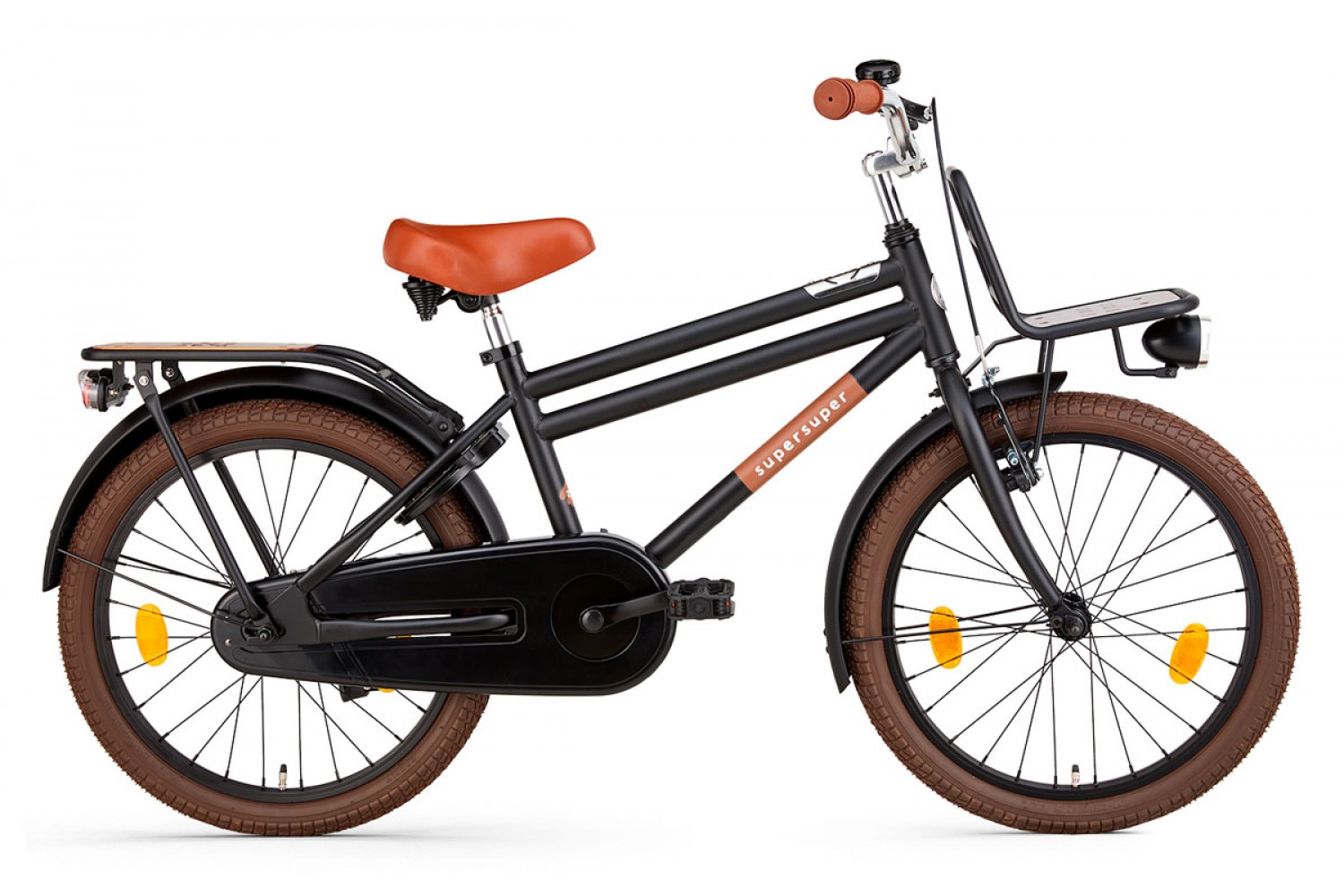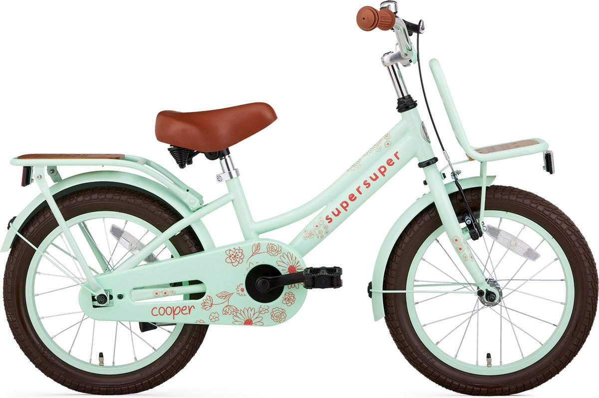 De Supersuper Cooper Bamboo Jongensfiets 20 inch Mat Zwart is dé stoere transportfiets voor kleine jongens! Met de met bamboe ingelegde voordrager en bagagedrager neemt jouw kleine al zijn spulletjes mee. Het matzwarte frame en met bruine accenten en geeft de fiets een gave uitstraling. De Supersuper Cooper Bamboo Jongensfiets 20 inch Mat Zwart is uitgerust met een terugtraprem en enkele handrem, zodat je zoontje veilig tot stilstand komt. De veilige gesloten kettingkast, zijwieltjes, reflectoren, fietsbel en comfortabele zadel maken van deze Supersuper Cooper Bamboo Jongensfiets 20 inch Mat Zwart een echt feestje! Bovendien is deze Supersuper Cooper Bamboo voorzien van felle LED batterijverlichting en een ringslot. Wanneer stapt jouw zoontje op deze gave Supersuper Cooper Bamboo transportfiets?
